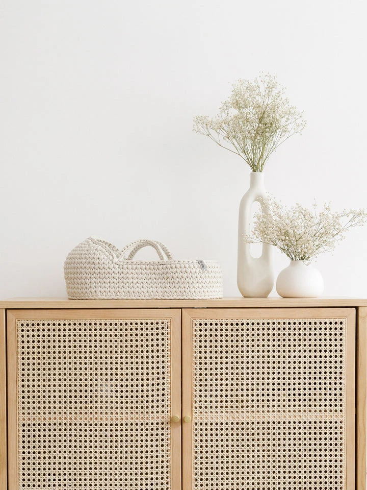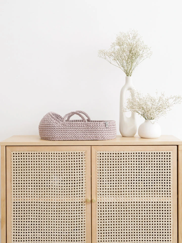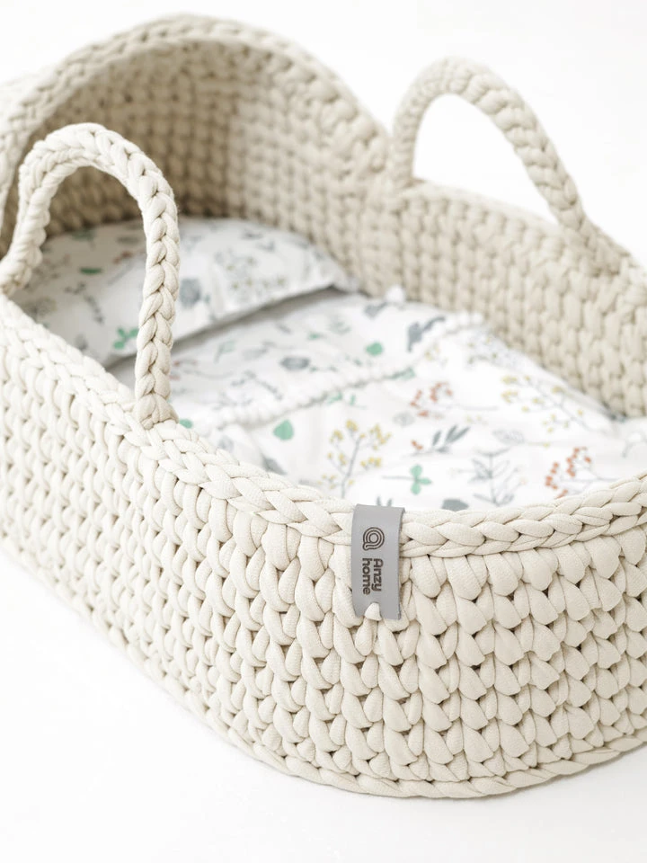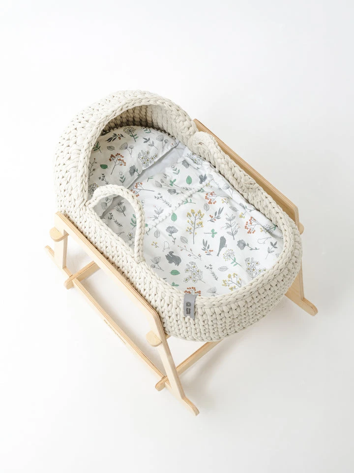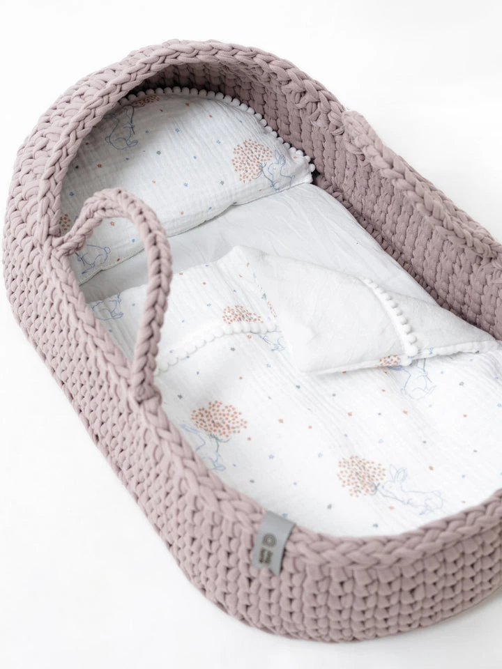 - Includes a mattress and reversible cotton bedding with two sides — one patterned and one plain — decorated with charming pompoms. The bedding matches the basket as shown in the photo.