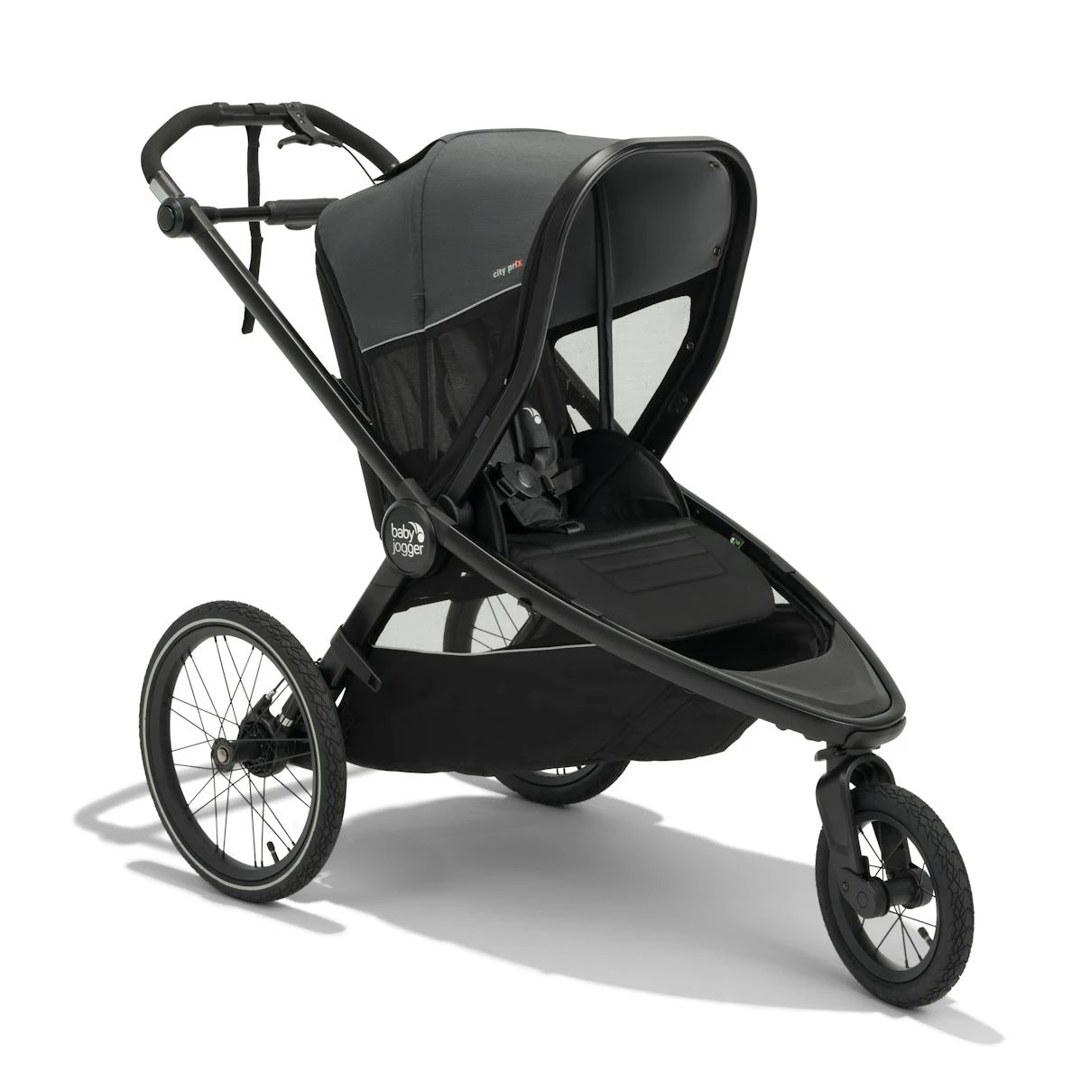 From the inventor of the jogging stroller comes the first of its kind Baby Jogger® city prix™ jogger x bike trailer, an innovative jogging stroller crossover designed for ultimate off-road experiences and can easily transition to an aerodynamic bike trailer (trailer kit sold separately). All-wheel suspension and Innova rubber tires help absorb the bumps of more rugged terrain. Integrated safety reflectors provide better street visibility, and the stroller’s front swivel wheel easily locks for jogging or running.