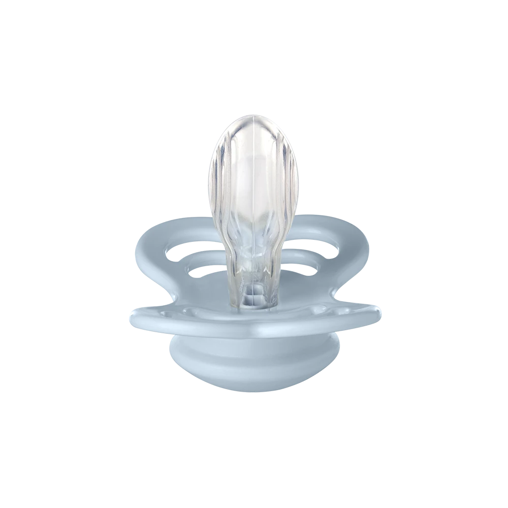 The BIBS Supreme pacifier features an exclusive wide shield pacifier. With its symmetrical flat, drop-shaped nipple, it promotes a tongue placement and sucking technique where the tongue is flat and presses the pacifier flat against the palate. This means that the baby does not have to suck as hard as with a round pacifier for the pacifier to flatten out inside the mouth.