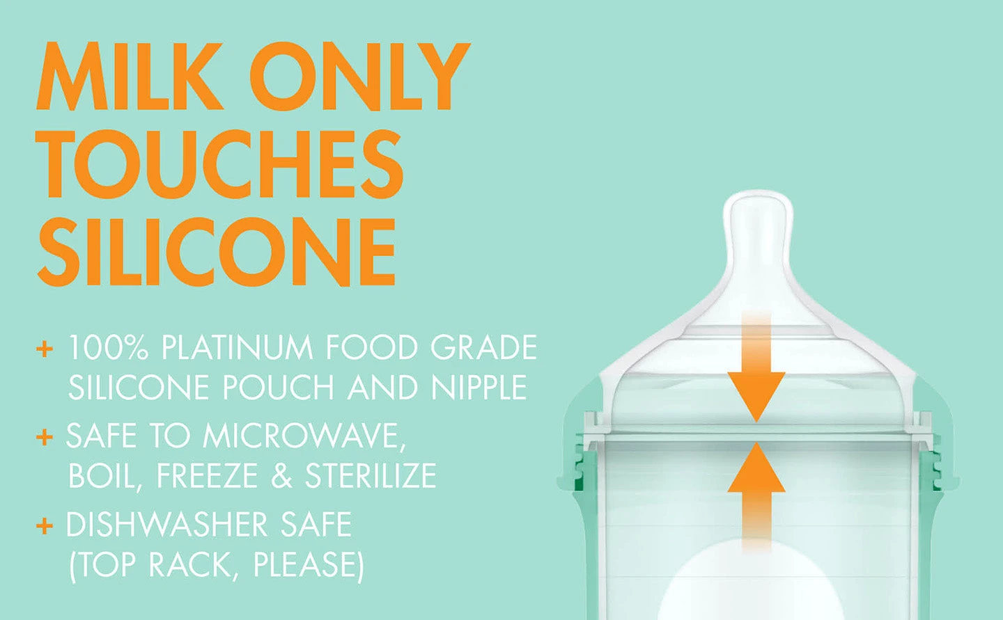 - The only thing your baby’s milk comes in contact with is the platinum food-safe silicone of the nipple and pouch.