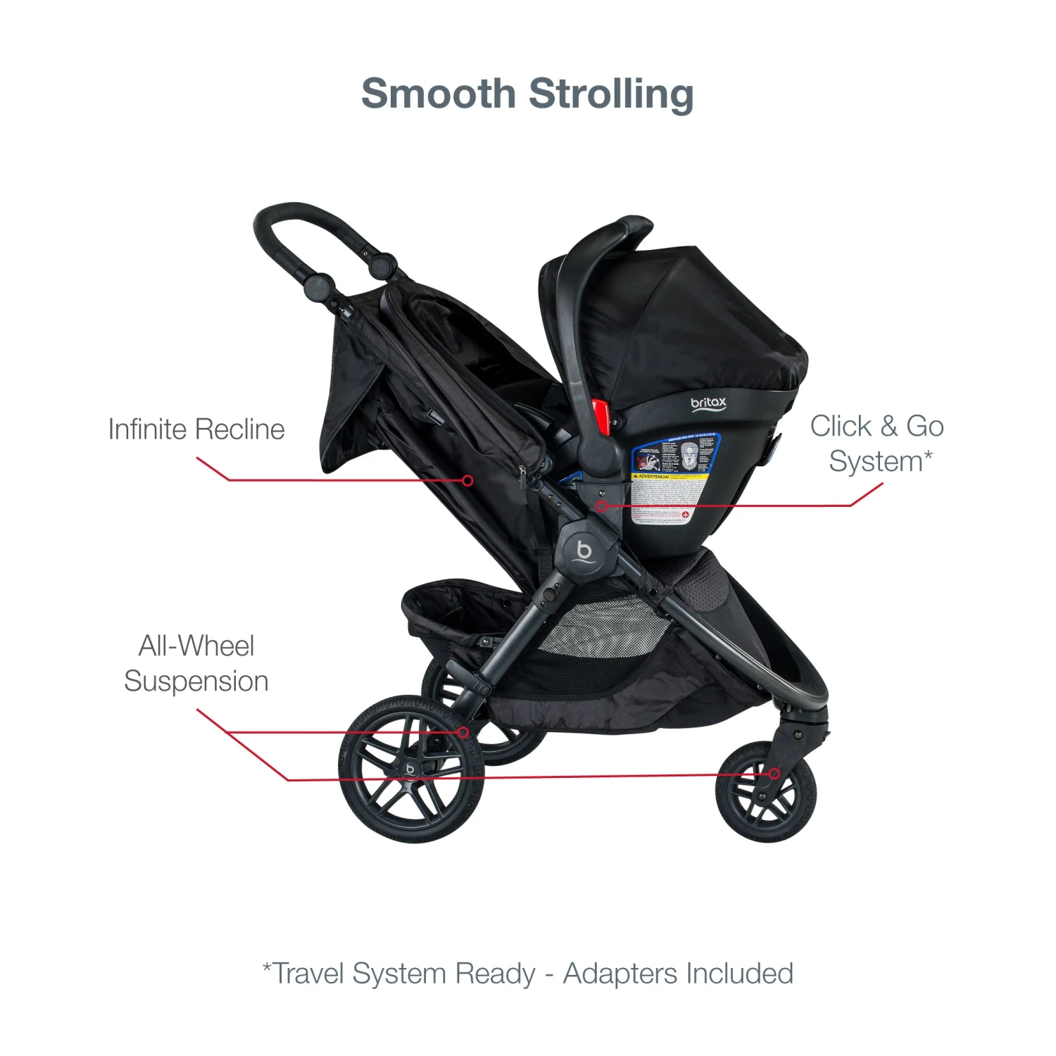 - Click & Go System lets you click in your Britax infant car seat and keep going.