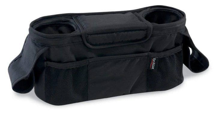 The Britax Stroller Organizer provides convenient storage for all essentials while out for a stroll. It easily and securely attaches to almost any stroller handle and is adjustable to its angle and width. It features two insulated beverage holders, a large center compartment with magnetic closure, and three outside pockets. The collapsible design does not interfere with the stroller fold.