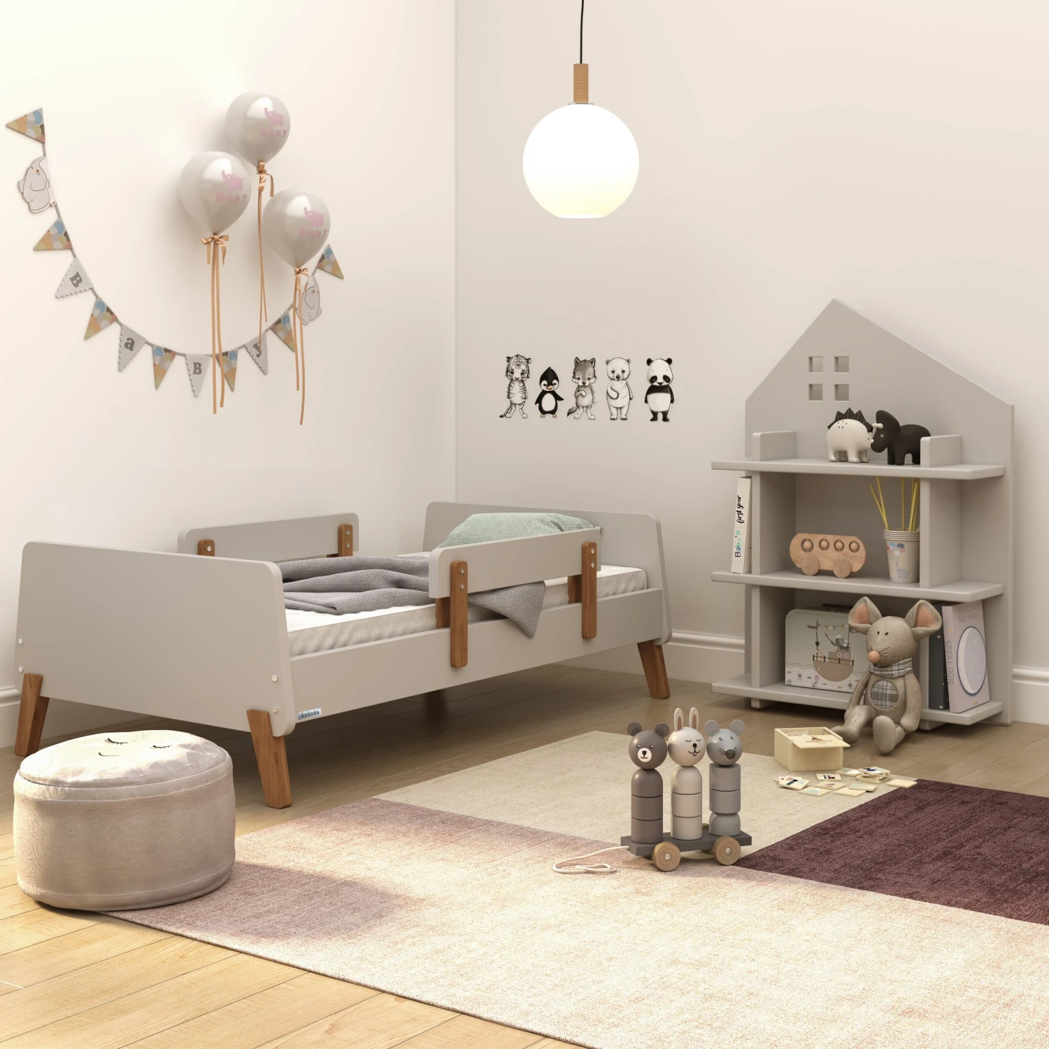 A sturdy bed built just for toddlers with playful curves and modern shapes to smooth the meaningful transition into “a real bed.” The low profile and two removable rails provide a safe and comfortable sleeping place that helps your active toddler easily get in and out of bed. This high-quality bed fits a standard crib mattress and brightens any decor with a pop of modern design.