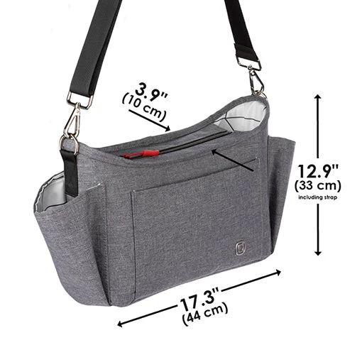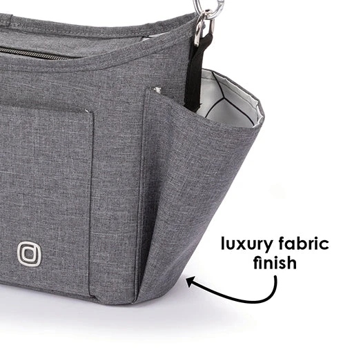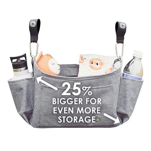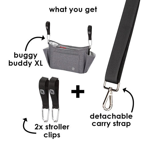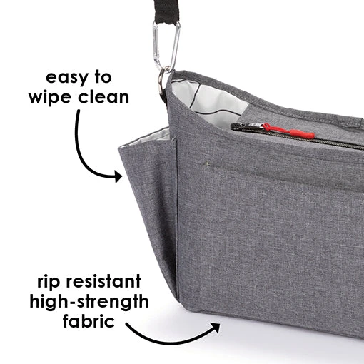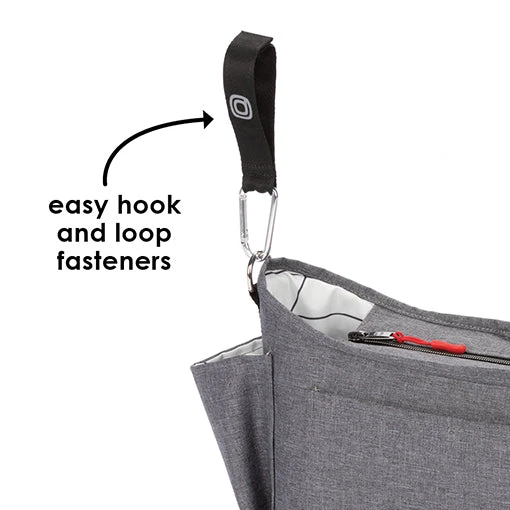 The Diono Buggy Buddy XL 8 in 1 stroller Stroller Organizer bag easily attaches to the bar of any stroller. This Bag includes 4 insulated slots for bottles, 2 zippered mesh pockets to store valuable stuff, and a large open compartment to store additional easy to reach necessities.