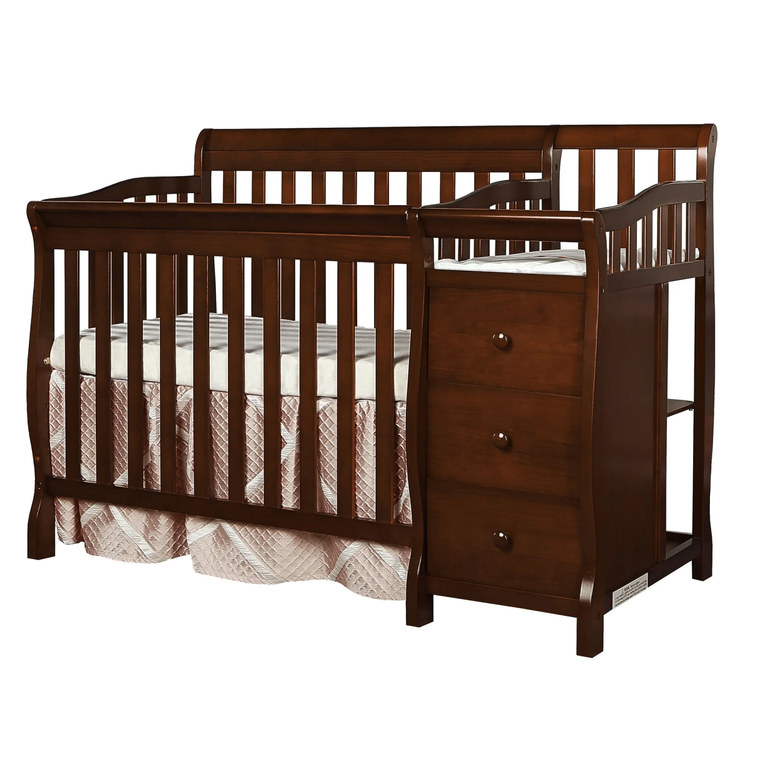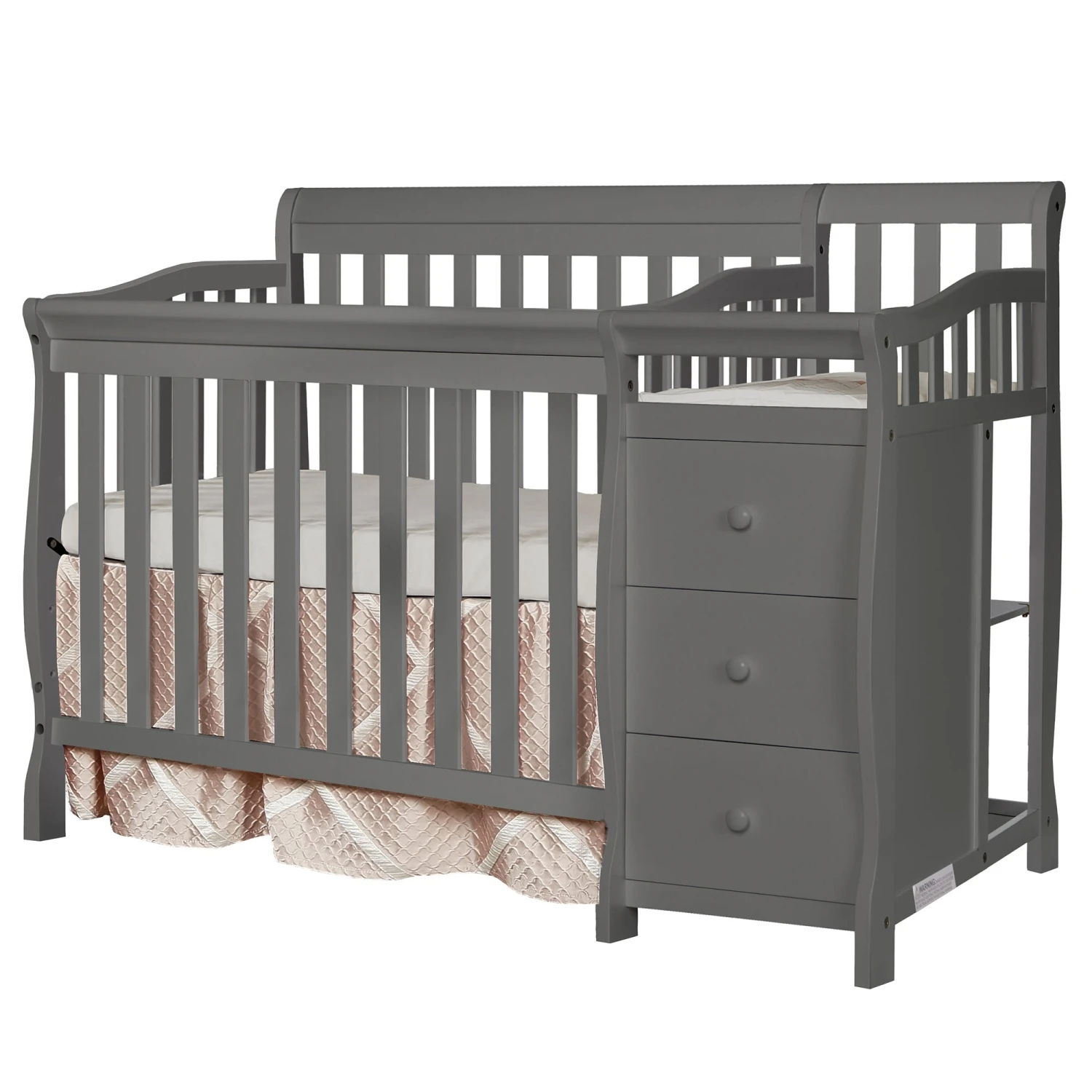 The Jayden 4 in 1 Mini Convertible Crib and Changer Modern crib have extra features like a changing station and the extra attached space. With this model, you will find precisely what you are looking for! Comfortable yet solid with integrated drawers and shelves, easy to assemble. Beautifully constructed multipurpose crib offers a sturdy rail for safety, three-level mattress support, and a 1-inch mattress pad. The changing table is armed with a changing pad and restraining strap with an easy release buckle to secure the baby safely in place. It is the perfect option for small spaces without giving up fashion, function, or safety.