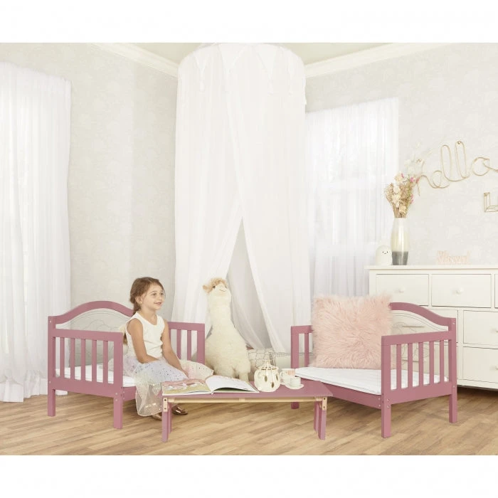 Say Hello to the ever-so-whimsical addition to your little girl’s room. The Dream On Me Rosie Toddler Bed is the perfect must-have for a growing toddler. It grows with your little one by easily converting from Toddler Bed into a Table and Chairs (conversion kit sold separately). The soft, aesthetic touch of intricate rose decals on the footboard and headboard makes this toddler bed a beautiful addition to your child’s room.