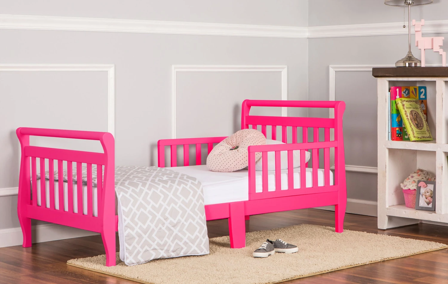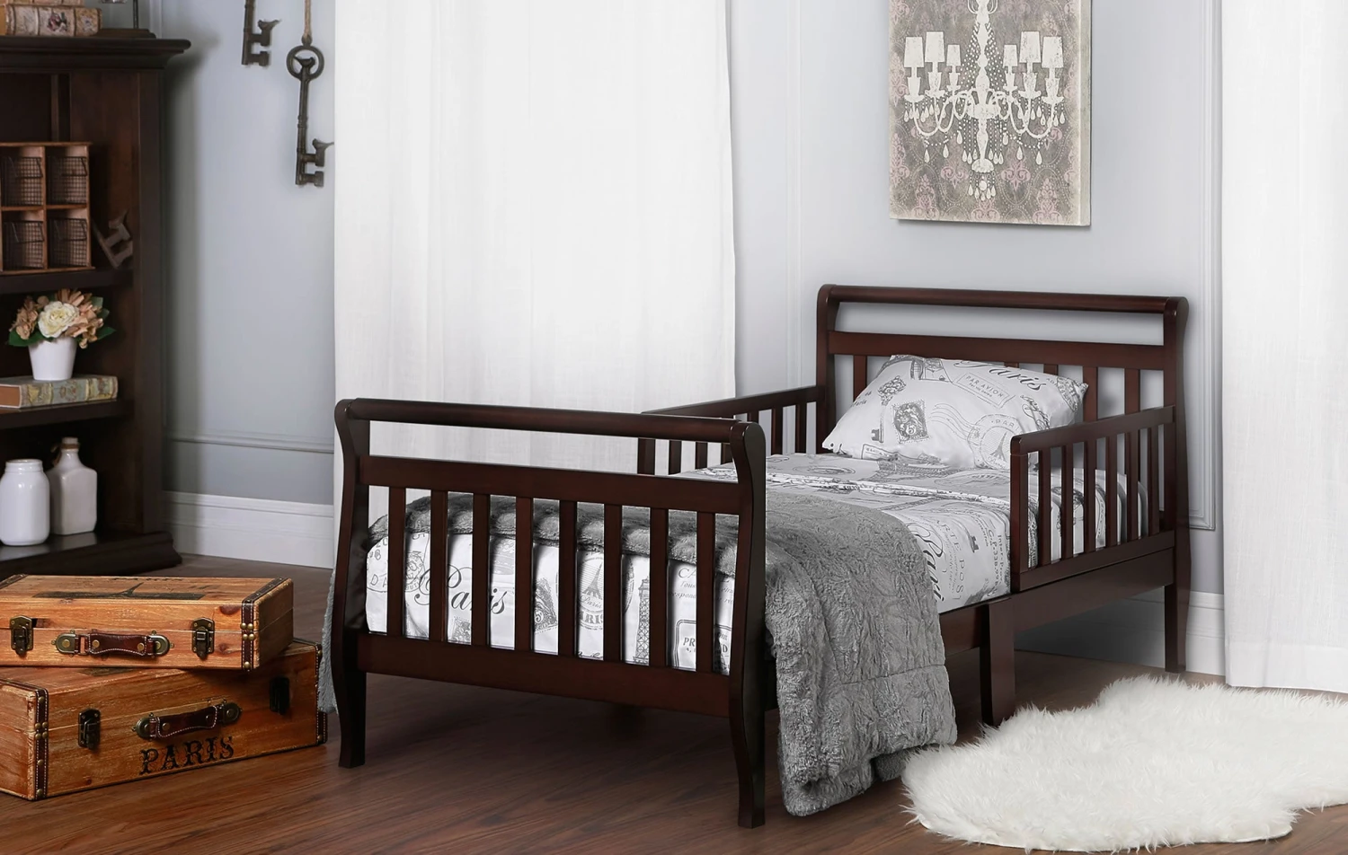 The Dream on Me Sleigh Toddler Bed is an attractive, solid wood, classic, sleigh design bed for your toddler. Set at precisely the right height, it has been designed so that your toddler can safely get in and out of bed. Comes complete with two side safety rails for added security and a beautiful Non-toxic finish. It is the perfect transition for toddlers, who have outgrown their cribs but are still too small for an adult bed.