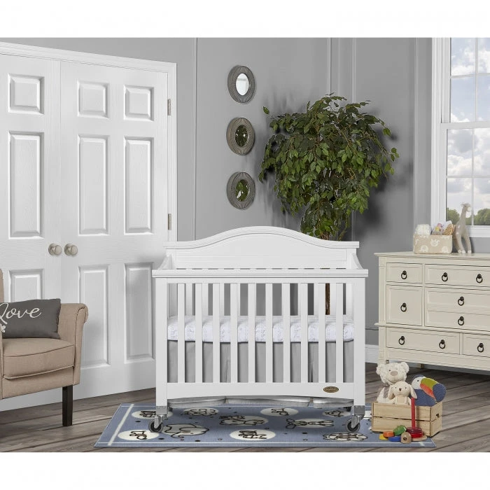 Dream On Me Venice offers a contemporary design for modern families. This crib features a bell-shaped headboard, removable wheels, patented mattress adjustment mechanism with folding sides. This crib is perfect for a loft nursery with its lightweight and folded design it can be moved easily throughout the home or folded for storage. Venice creates an urban or modern styling that can be paired together with greenery and elements of the outdoors to showcase how minimalism and nature make the perfect combination.