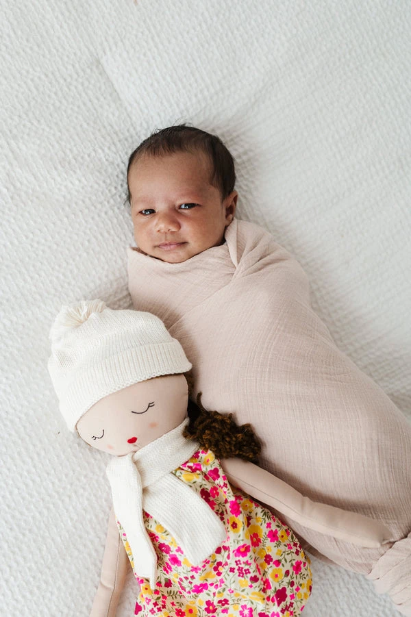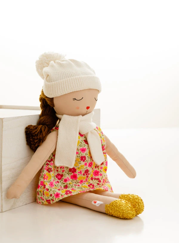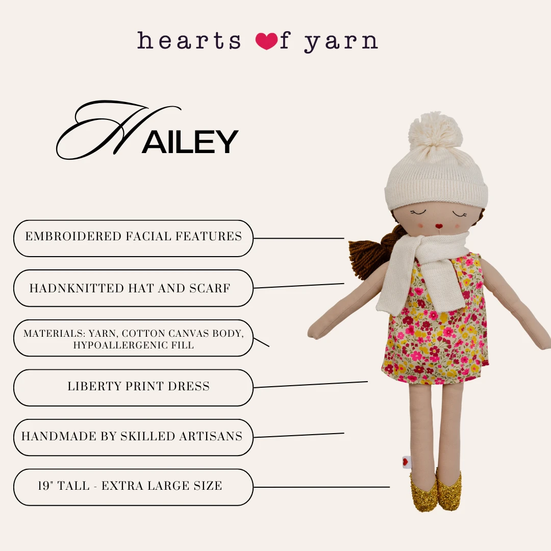 Ely’s & Co. Hearts of Yarn Hailey Doll is a skilled creator and knitter who takes pride in wearing her handmade pieces. Hailey is wearing a Liberty print dress with a matching hand-knitted hat and scarf. She comes in a branded cloth drawstring bag with her name on it so she can travel safely.