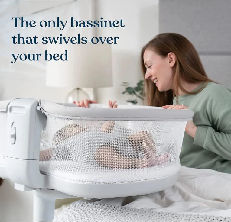 The Halo BassiNest Sleeper swivels over your bed so that you can sleep inches from your baby. The lowering wall makes it easy to scoop them up for cuddles or feeds in bed. It converts to a portable nest so you can stay close to them during the daytime, too.