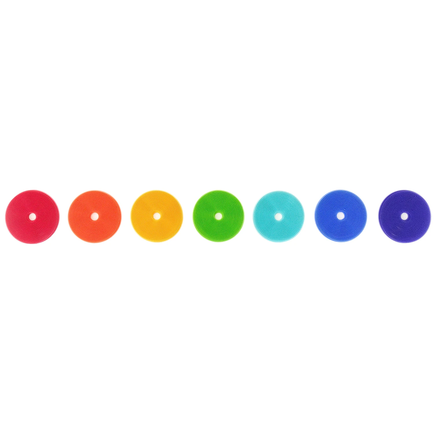 Introduce your child to the fascinating colors of the rainbow, while encouraging bath time fun with the Rainbow Spots silicone bath toy. Your child can count, stack, lather and even stick their Rainbow Spots to the side of the bathtub or shower door, with no adhesive required! Our product testers loved sticking the flat soapy side to the tub wall and to watch them race to see which one makes it to the water first! Best of all silicone is naturally odor and mildew resistant, and can be sterilized for a deep cleaning. Each Rainbow Spots comes with 7 brightly colored discs, use with your favorite body wash to create a soothing lather and therapeutic massage.