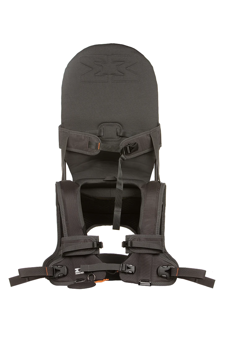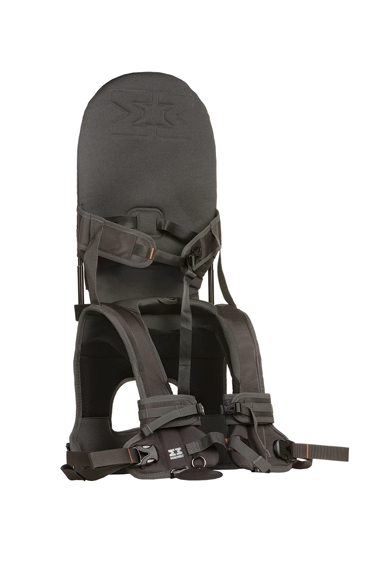 - The child sits safely on your shoulders, secured by a waist belt and leg straps.