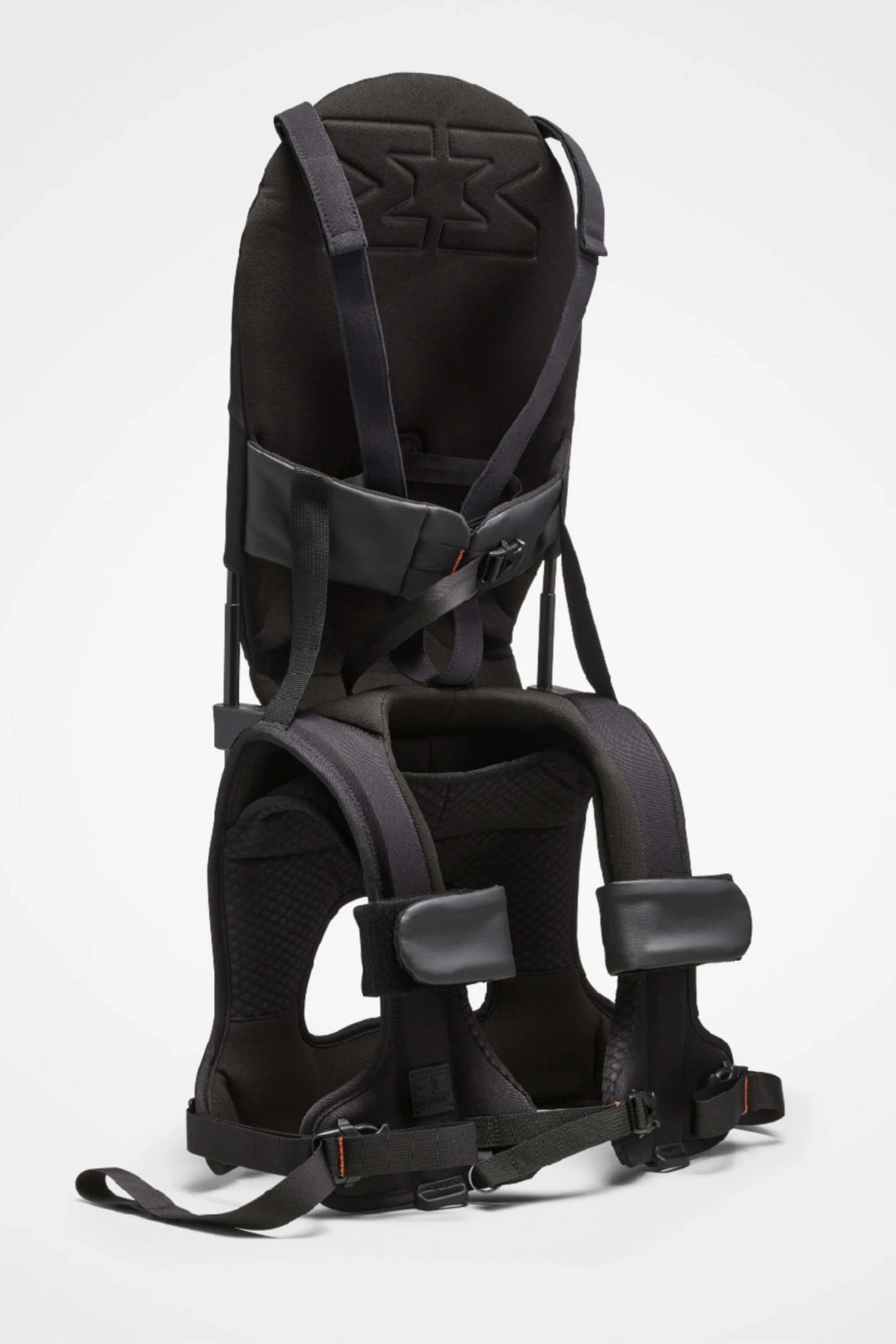 - The child sits safely on your shoulders, secured by a waist belt and leg straps.