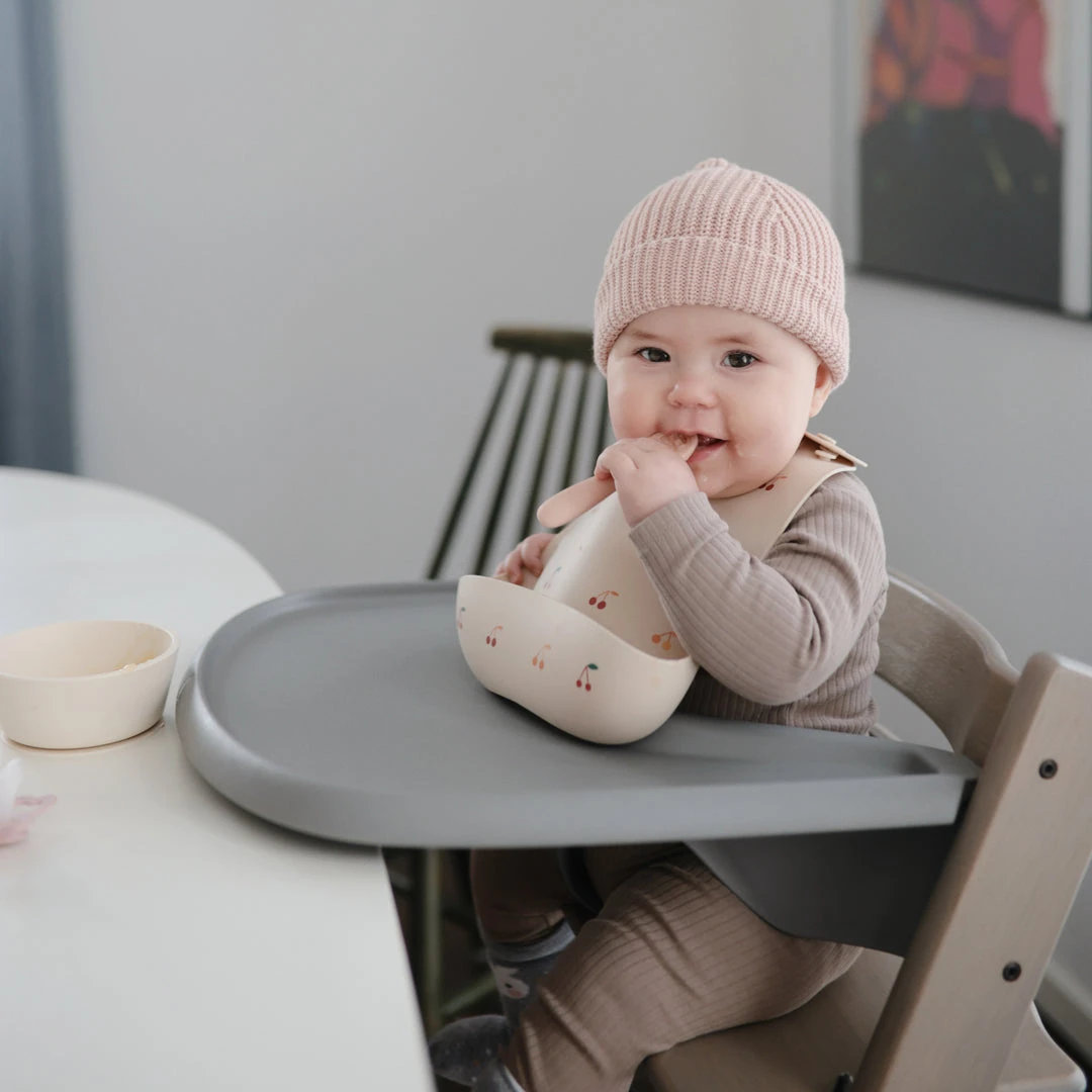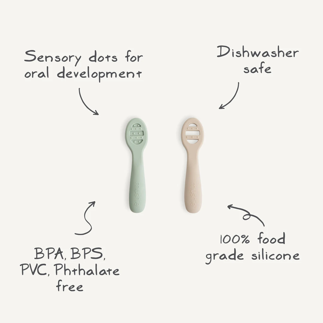 Mushie First Feeding Baby Spoons are designed to make your little one’s transition to self-feeding smoother. Stage 1 has a solid surface without holes, ideal for thin purees and yogurts. When ready for heartier textures, babies can transition to Stage 2 with open slots for scooping thicker foods like oatmeal and mashed potatoes. Both versions include sensory dots on each side, providing a soothing experience for teething gums. The flat design ensures there’s no wrong way to pick up the spoons, making it easy for little hands to manipulate without requiring wrist rotation.