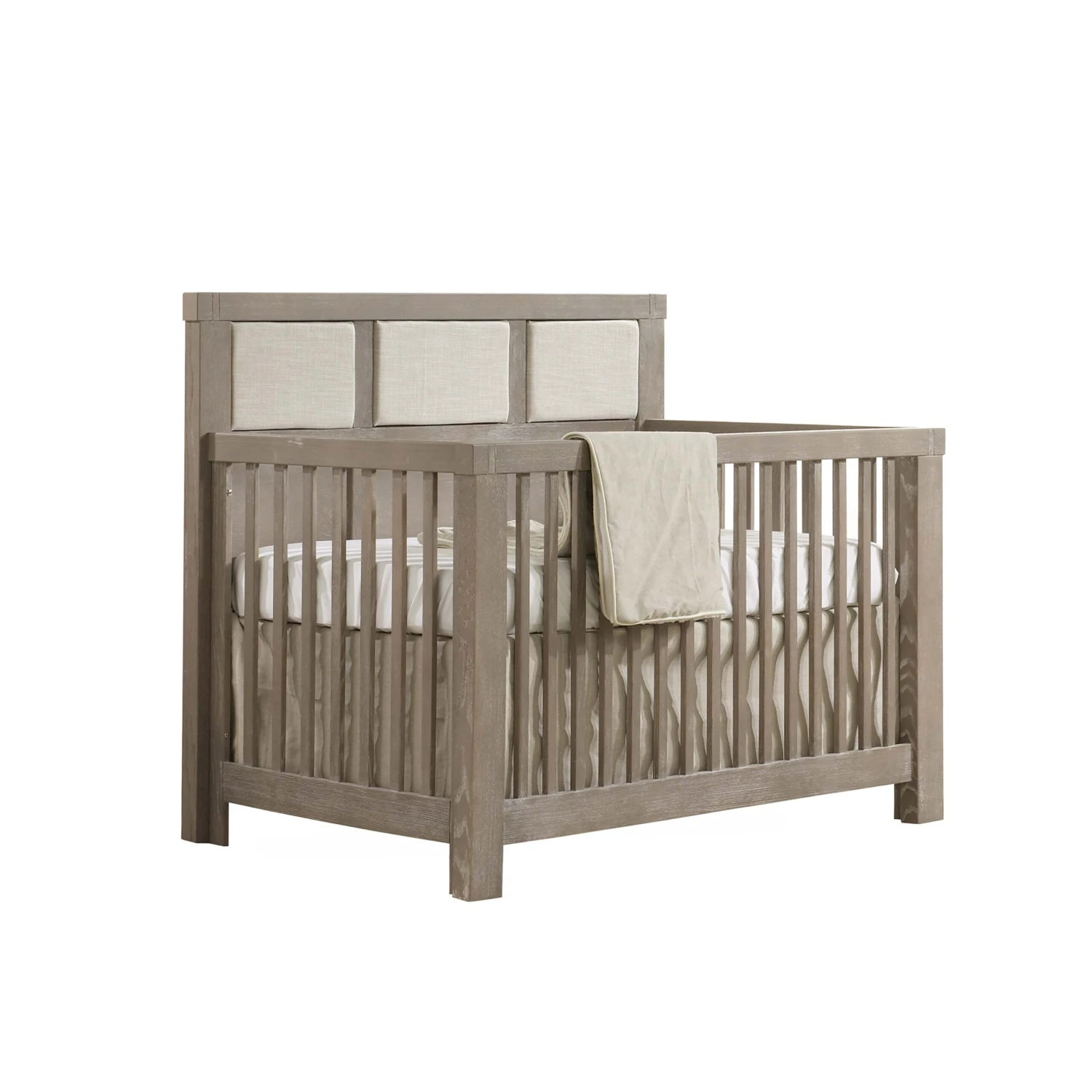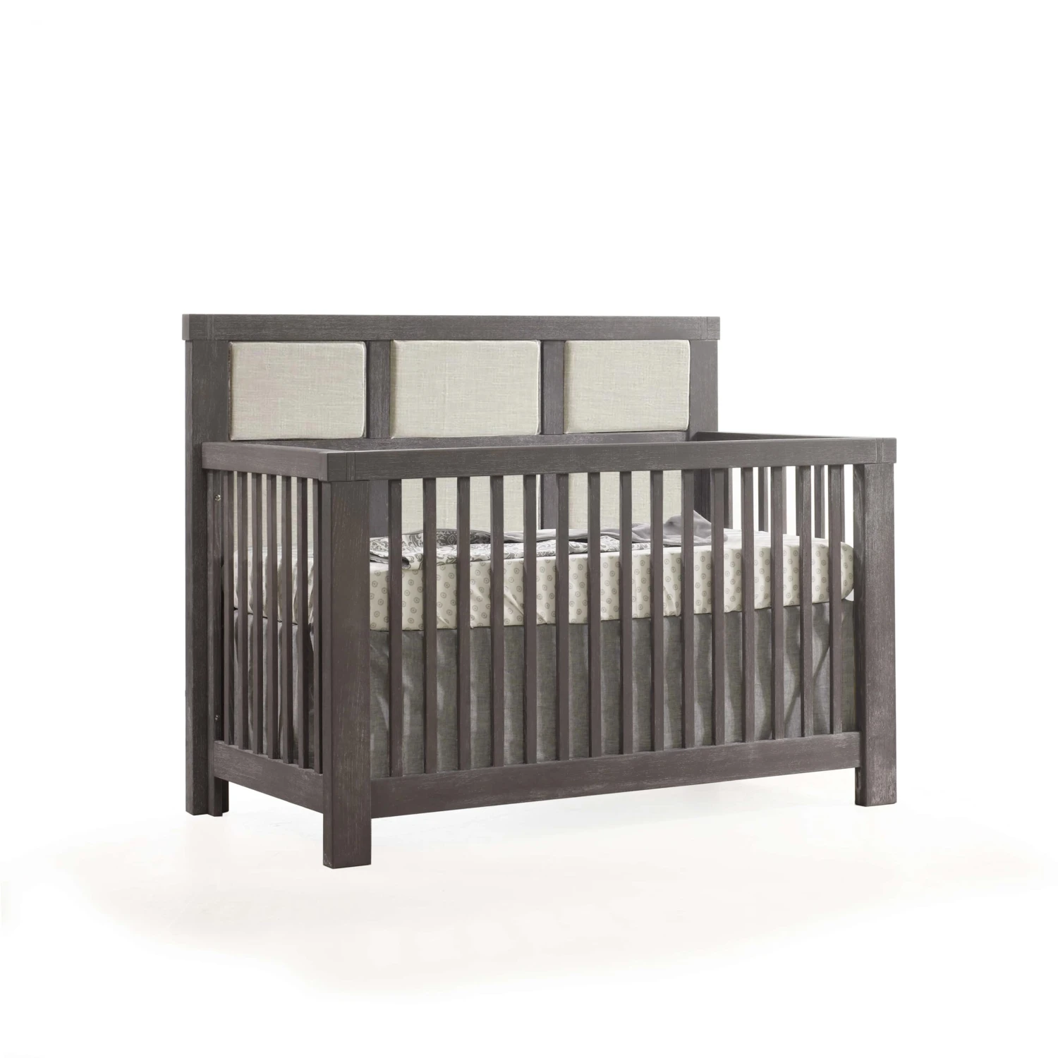The Natart Rustico ”5-in-1” Convertible Crib with Wood Panel, with its delicate detailing, will adapt to infinite decorating choices for your nursery. The detailing on its solid full-panel headboard is chunky top moldings with an open mortise & tenon detail, an elegantly framed back panel, and one-piece corner posts. The Upholstered Panels heavy-duty, hand washable fabric in a Talc linen weave. It offers long-term value with five configurations: crib, toddler bed, daybed, double bed headboard, and complete double bed.