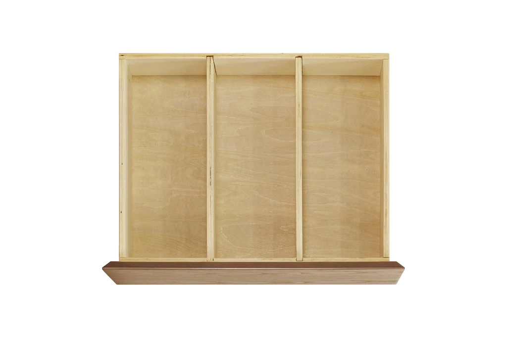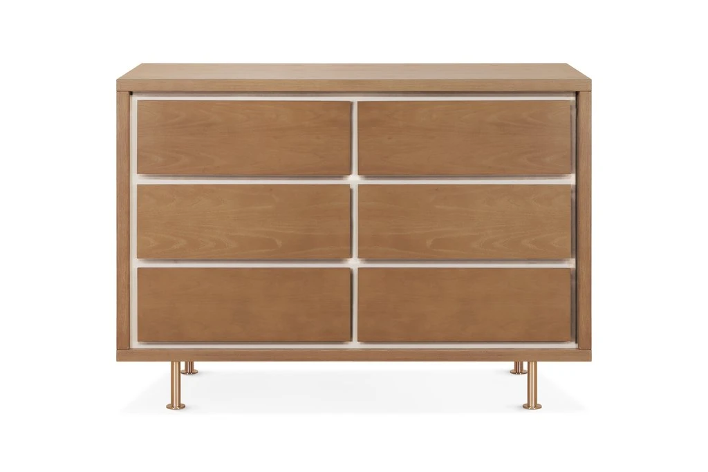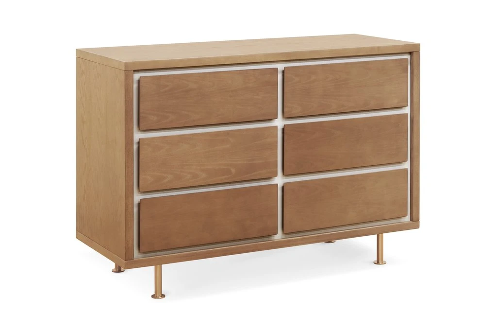 The Novella 6-Drawer Double Dresser is highlighted by the contrasting, inset, ivory-painted panels. Each dresser is given a satin finish with our water-based stain that highlights the natural Ash grain. The six spacious drawers offer ample storage for baby essentials, clothing and bulky items, while the removable dividers allow parents to create compartments suited for stacking diapers or holding little items such as socks that tend to get lost in big drawers.