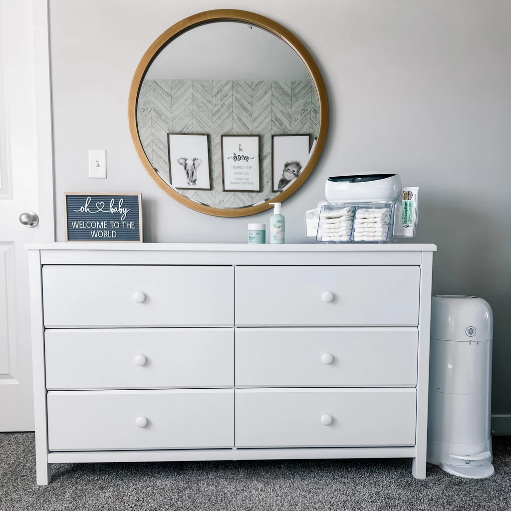 - Two Removable Side Bins store diapering and grooming accessories.