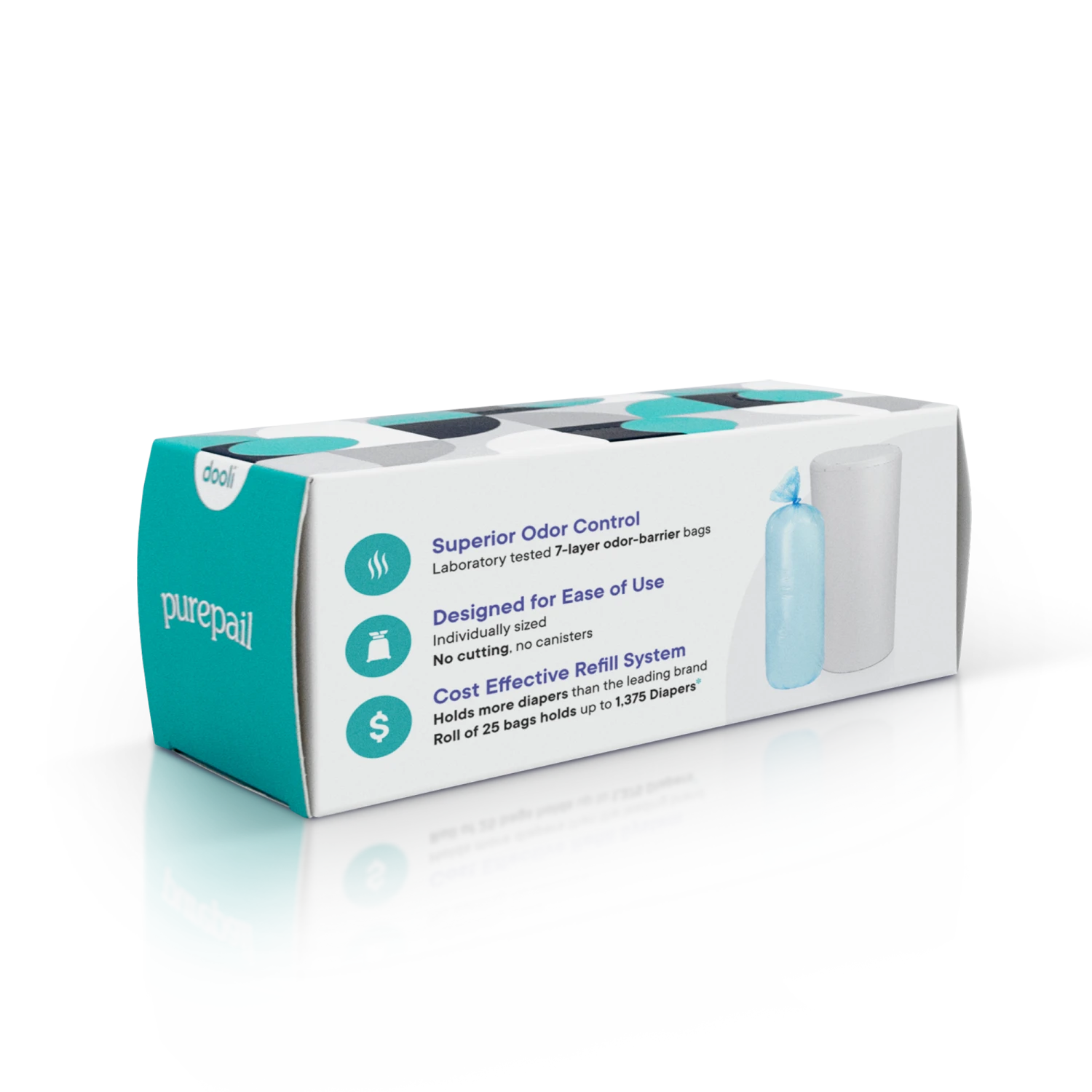 PurePail™ Odor-Barrier 7-Layer Bags are constructed with multiple layers of thin plastic film so oxygen can’t pass through the layers, making it impossible for smelly diaper odors to escape! But just to make sure, we had our bags laboratory tested. They passed with flying colors. Fits PurePail™ Classic.