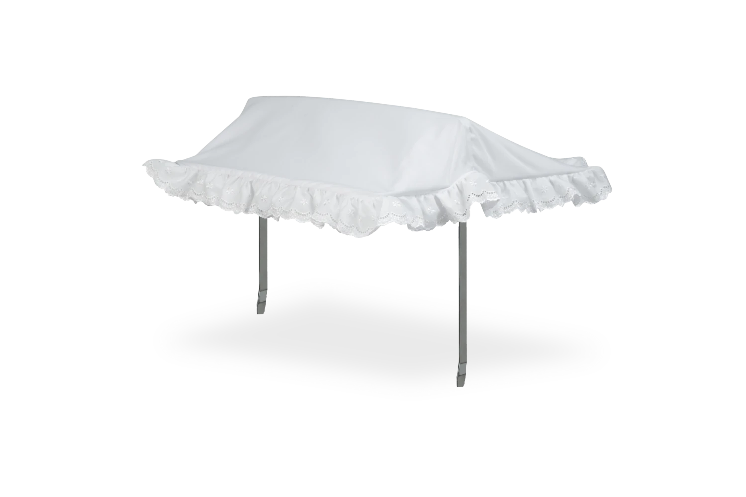 This Silver Cross Sun Canopy is a delightful addition to the Doll’s pram, perfect for shading precious dolls from the sun! It features a strong frame finished in chrome and a detachable crisp white cotton canopy decorated with adorable Broderie Anglaise trim.
