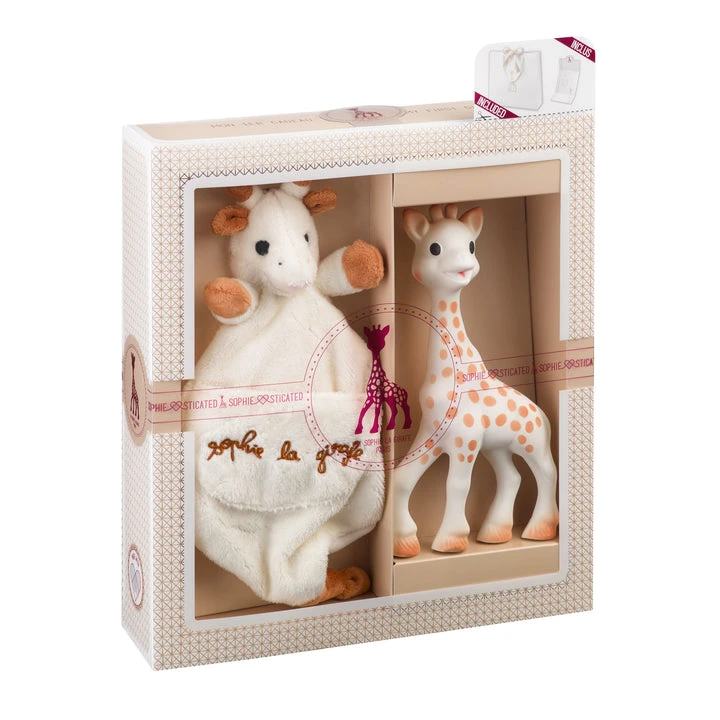 - This set includes a Sophie the Giraffe toy, a plush lovey, a customizable notecard, and a lovely gift bag.