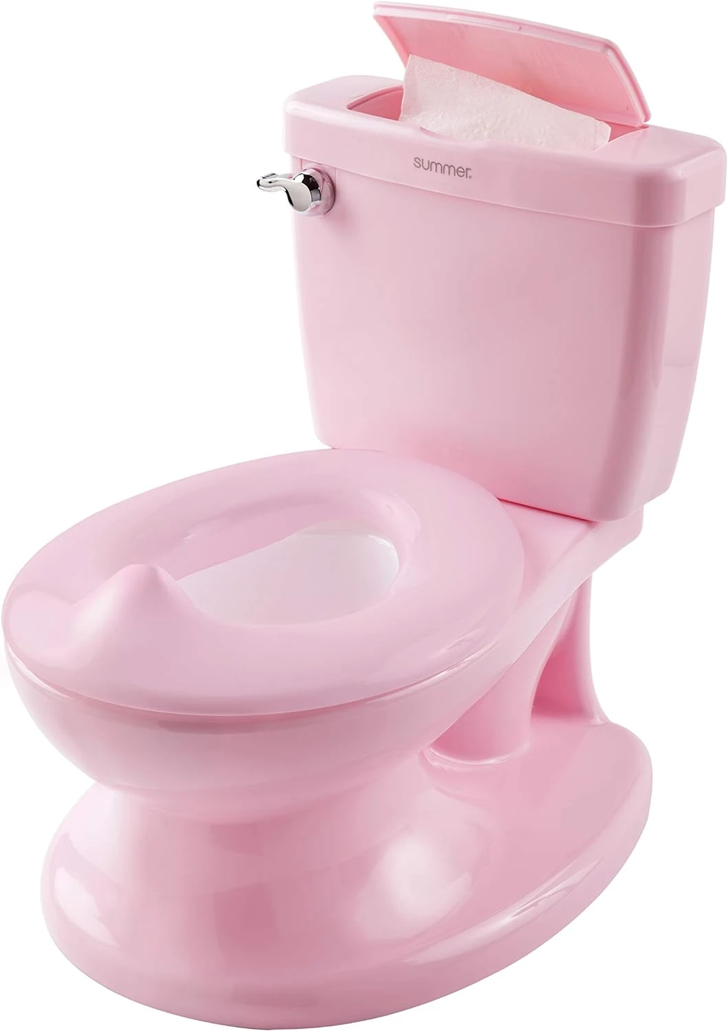 The Summer Infant My Size Potty features the look and feel of an adult toilet to help ensure a comfortable and confident transition to the real thing. The toilet handle features a flushing sound to reward and encourage your little one, and a built-in wipe dispenser promotes good hygiene habits.