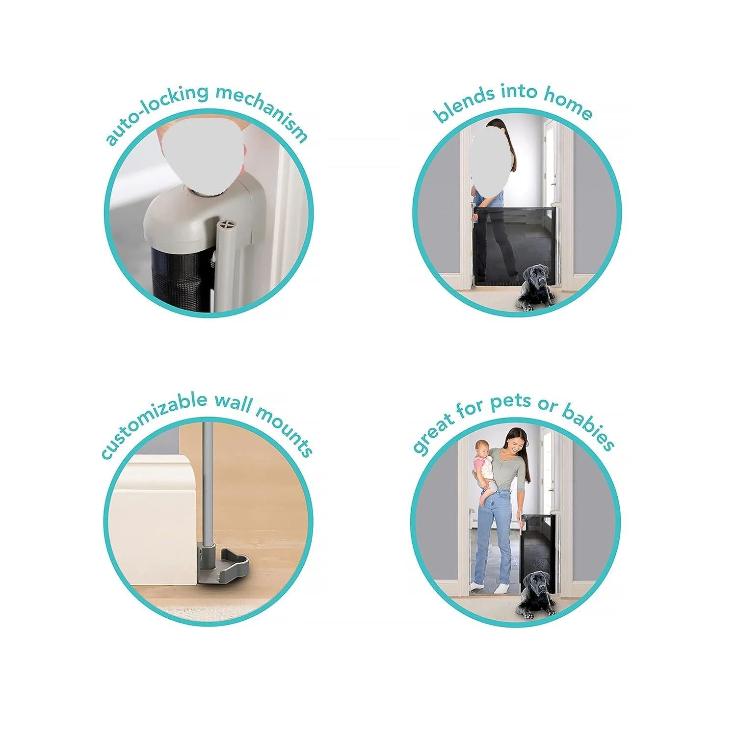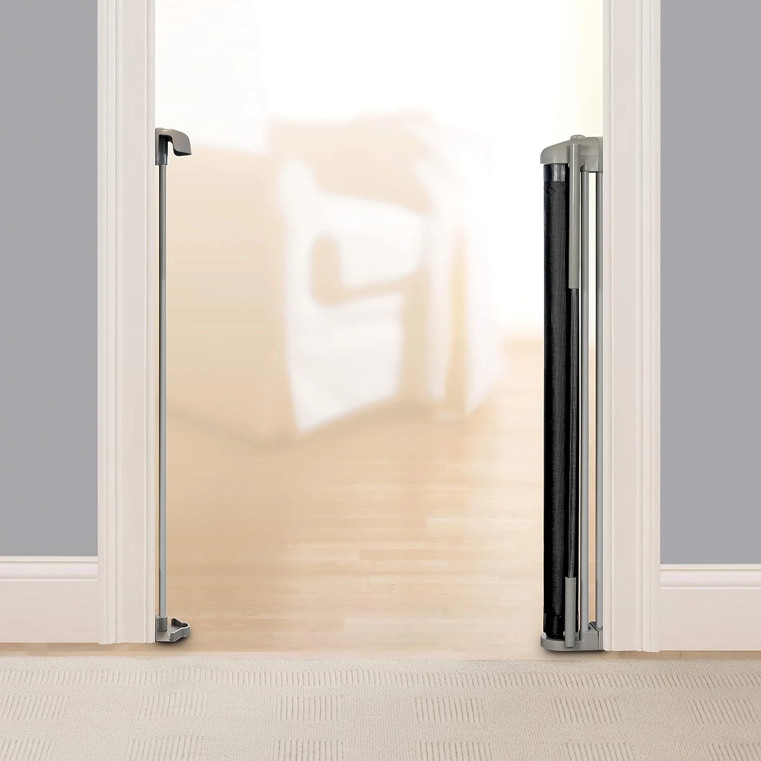 - Durable mesh fabric that can easily be extended and then released when not in use, allowing full access through doorways and hallways (as well as accommodating baseboards).