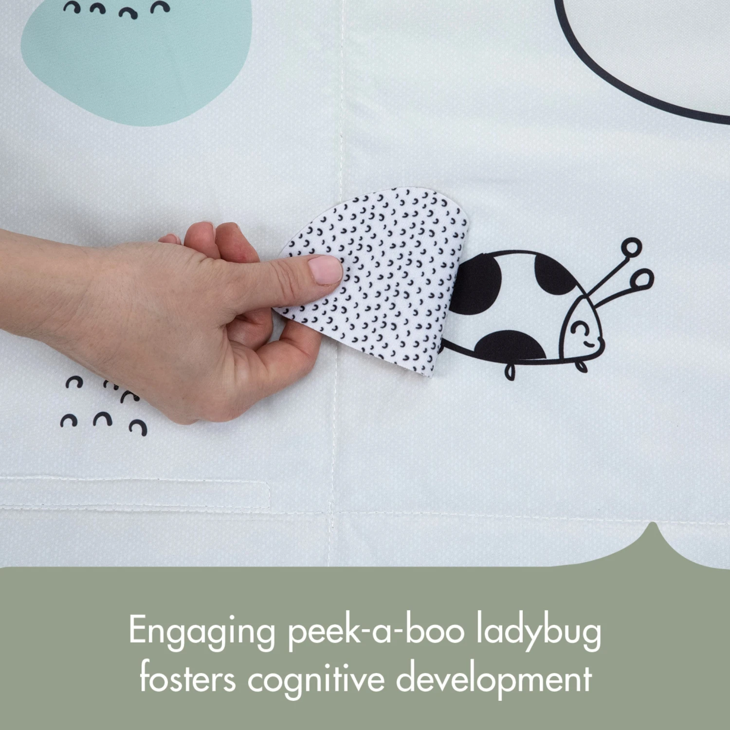 - 4 developmental activities to stimulate and engage baby’s senses include an easy-grip textured star, a peek-a-boo ladybug, shiny satin ribbons, and a crinkly peek-a-boo rainbow.