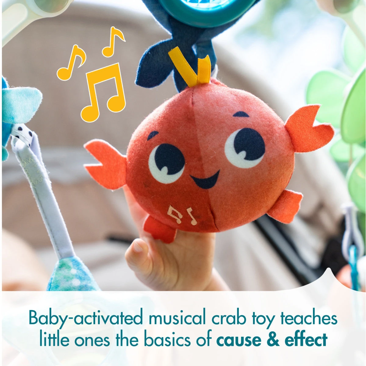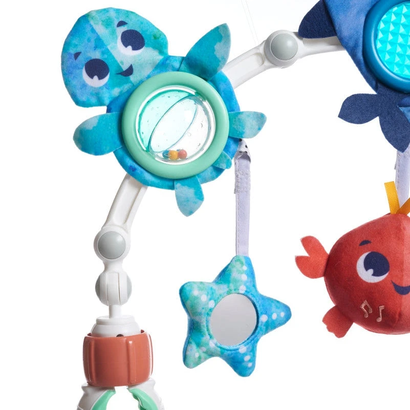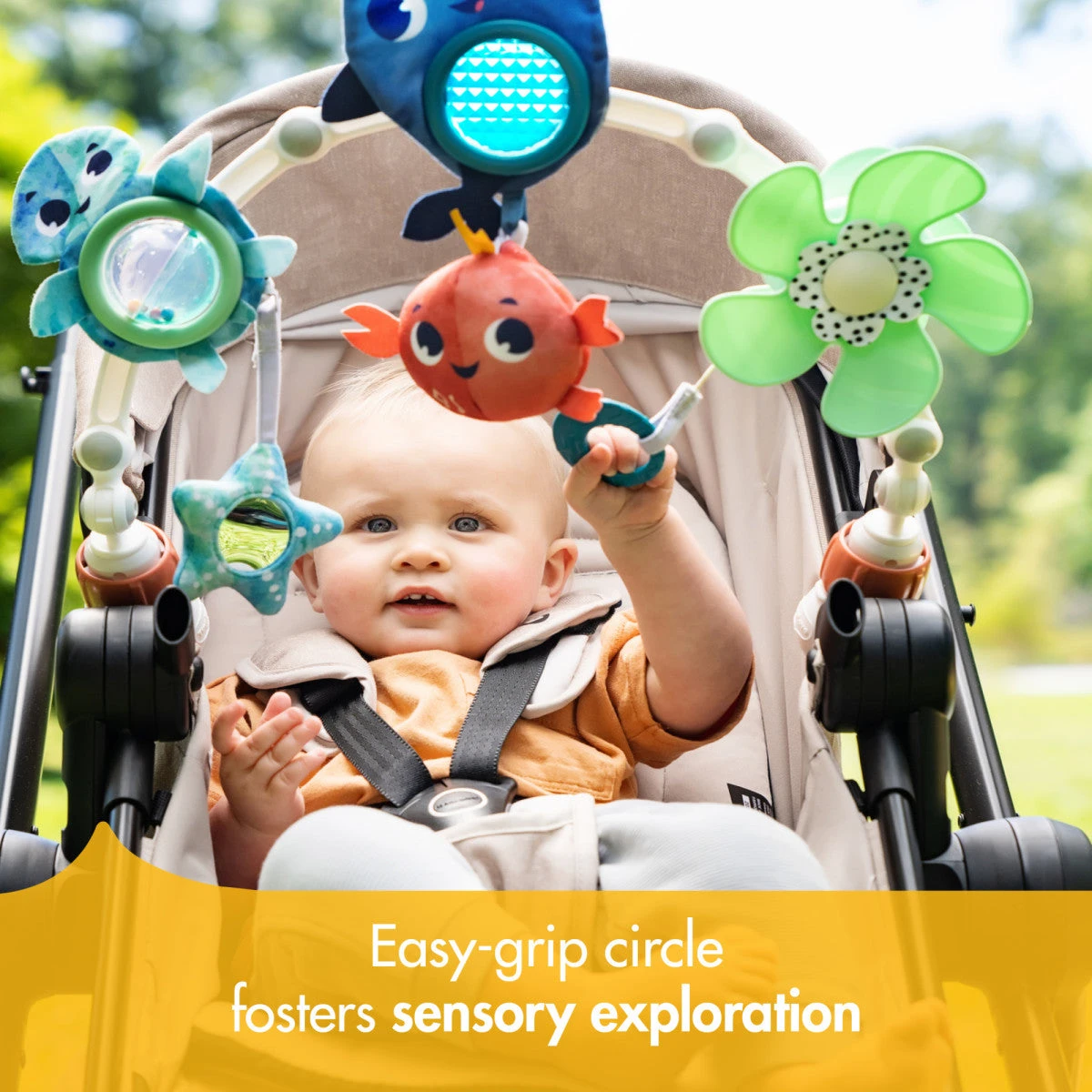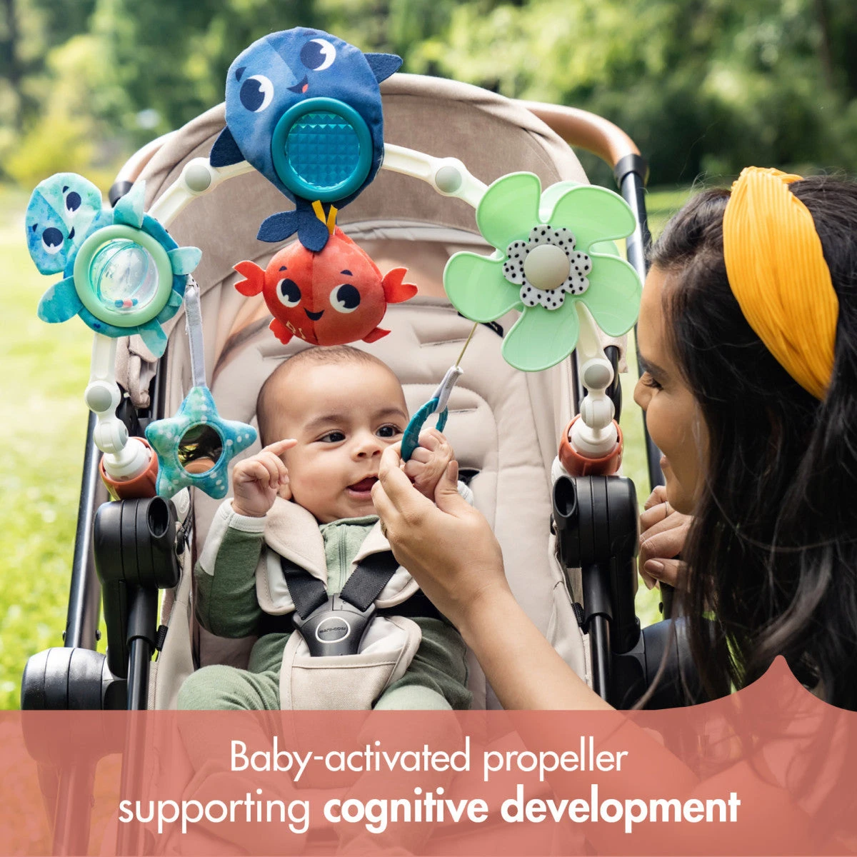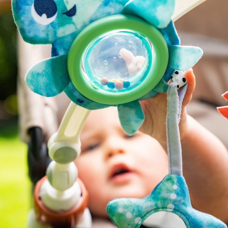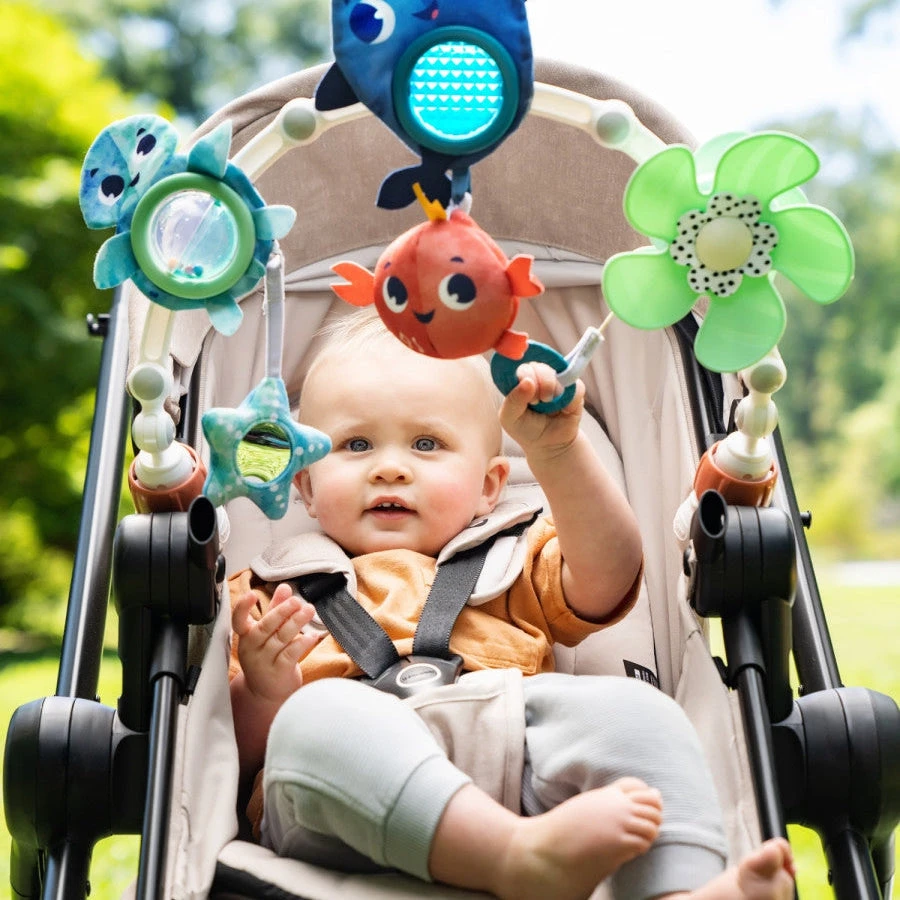 The Tiny Love Stroller Arch presents playful activities that provide indoor and on-the-go amusement. The different toys promote audio, visual, and tactile stimulation, supporting cognitive development.