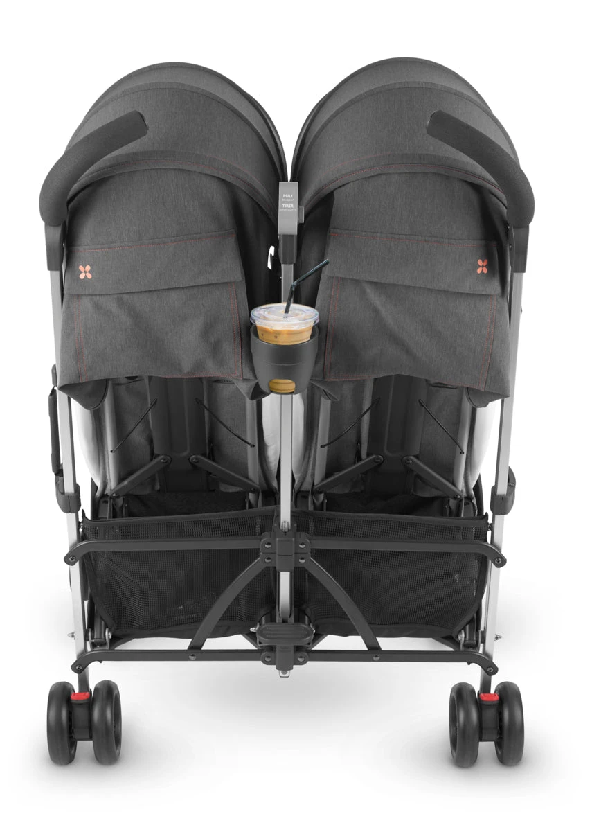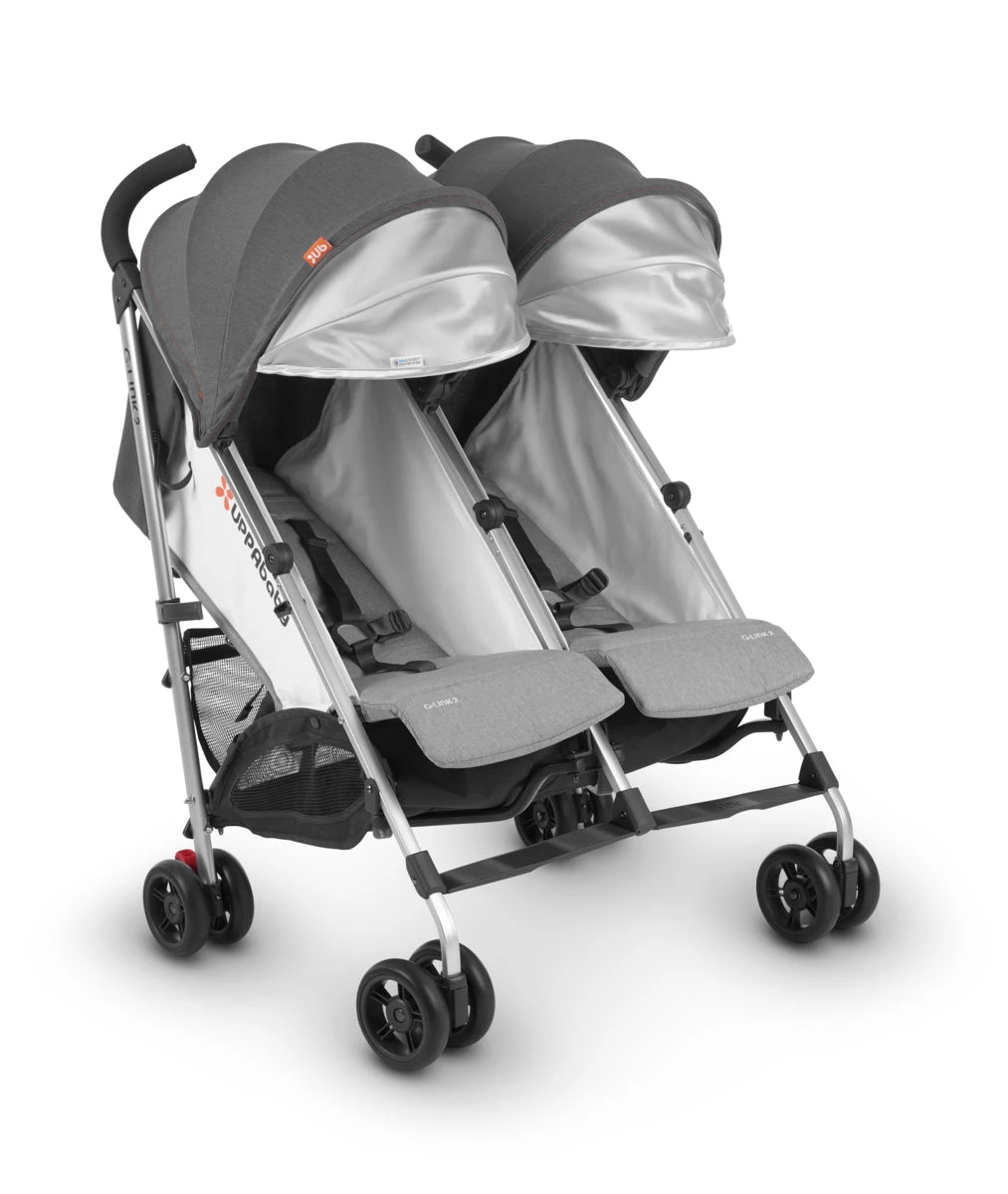 The G-LINK 2 stroller is a compact world-facing twin stroller suitable for kids ranging from 3 months – 55 lbs. This stroller includes 4 sets of wheels vs. the standard 6 wheel twin stroller, creating a smooth and effortless push. The seats are comfortably padded and offer 3 independent recline levels to accommodate children with their individual needs. The canopies offer multiple layers of sun protection including a UPF 50+ pop-out sun visor. The easy access XL storage basket, and double canopy pockets provide convenient space for any belongings needed. Its simple and compact fold, free-standing capability, and durable carry strap create the perfect travel companion.